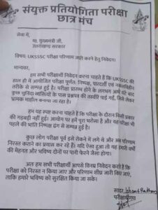 सचिव मुख्यमंत्री शैलेष बगोली से मंगलवार को सांय सचिवालय में संयुक्त प्रतियोगिता परीक्षा छात्र संघ के प्रतिनिधि मंडल ने इशांत रौथाण के नेतृत्व में भेंट कर मुख्यमंत्री को संबोधित ज्ञापन सौंपा। ज्ञापन में अनुरोध किया गया है कि यूकेएसएसएससी की हाल ही में आयोजित परीक्षा पूर्णतः निष्पक्ष, पारदर्शी एवं नकलविहीन तरीके से सम्पन्न हुई है। परीक्षा प्रारम्भ होने के लगभग आधे घंटे बाद कुछ चुनिंदा व्यक्तियों के पास प्रश्नपत्र की तस्वीरें पाई गई, जिसे लेकर भ्रामक माहौल बनाया जा रहा है।