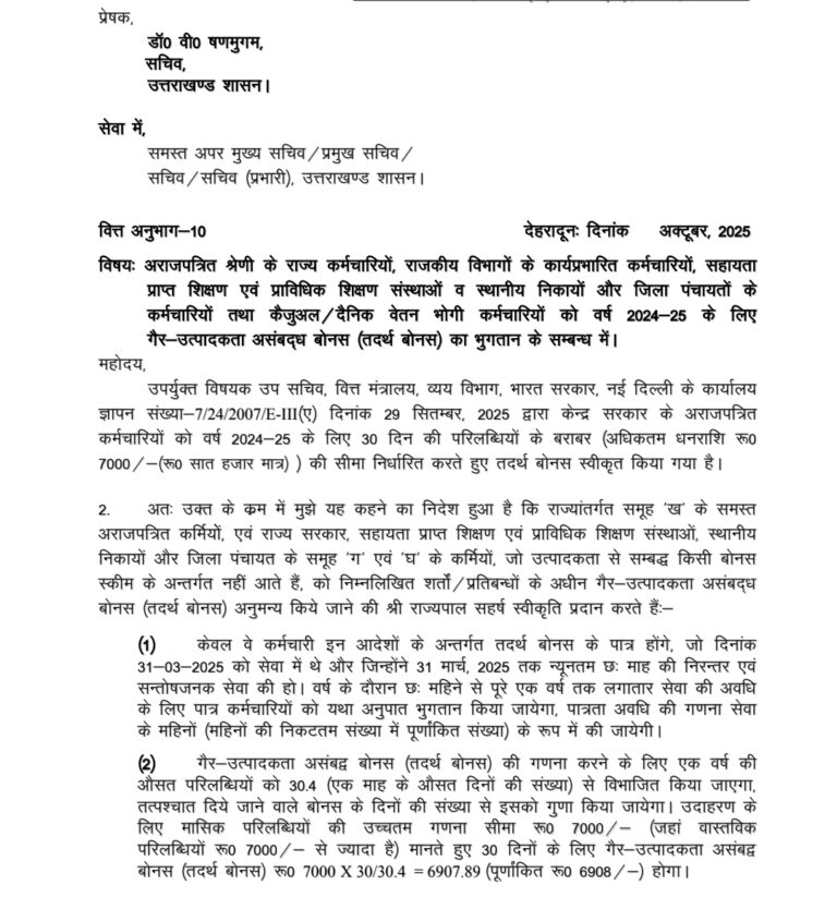 उत्तराखंड की धामी सरकार ने राज्य कर्मचारियों, राजकीय विभागों के कार्यप्रवर्तित कर्मचारियों, सहायताप्राप्त शिक्षण एवं प्राविधिक शिक्षण संस्थाओं, स्थानीय निकायों और जिला पंचायतों के कर्मचारियों सहित दैनिक वेतनभोगी कर्मचारियों को वित्तीय वर्ष 2024-25 के लिए गैर-उत्पादकता (तदर्थ बोनस) देने की घोषणा की है। इस संबंध में वित्त विभाग द्वारा आदेश जारी कर दिए गए हैं।