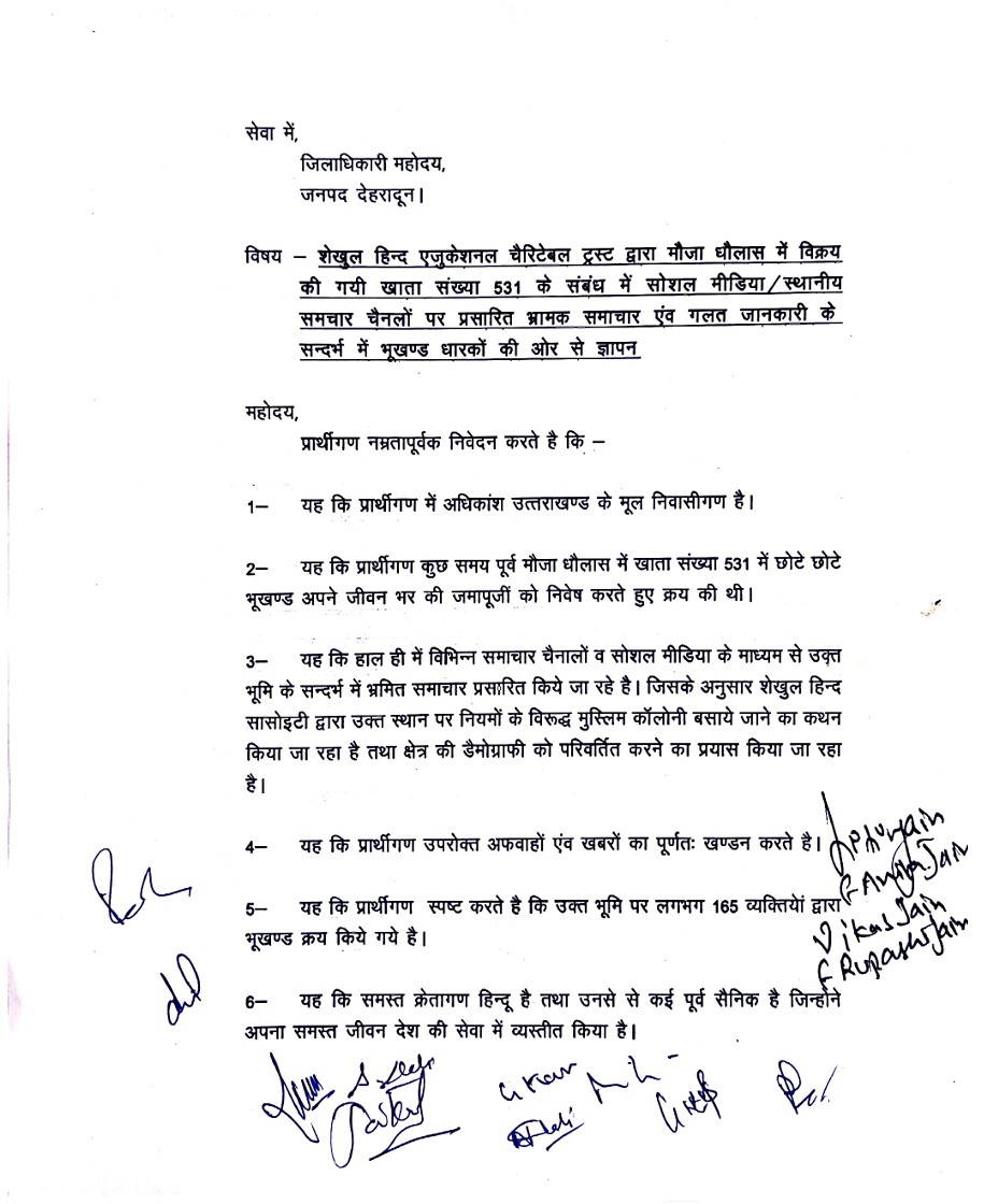 देहरादून के मौजा धौलास स्थित खाता संख्या 531 में शेखुल हिन्द एजुकेशनल चैरिटेबल ट्रस्ट द्वारा विक्रय की गई भूमि को लेकर सोशल मीडिया और कुछ स्थानीय समाचार चैनलों पर प्रसारित कथित भ्रामक खबरों के विरोध में भूखण्ड धारकों ने प्रशासन को ज्ञापन सौंपा है। भूखण्ड धारकों का कहना है कि भूमि के संबंध में जानबूझकर गलत और भड़काऊ सूचनाएं फैलाई जा रही हैं, जिससे उनकी सामाजिक छवि और निवेश पर संकट खड़ा हो गया है।
