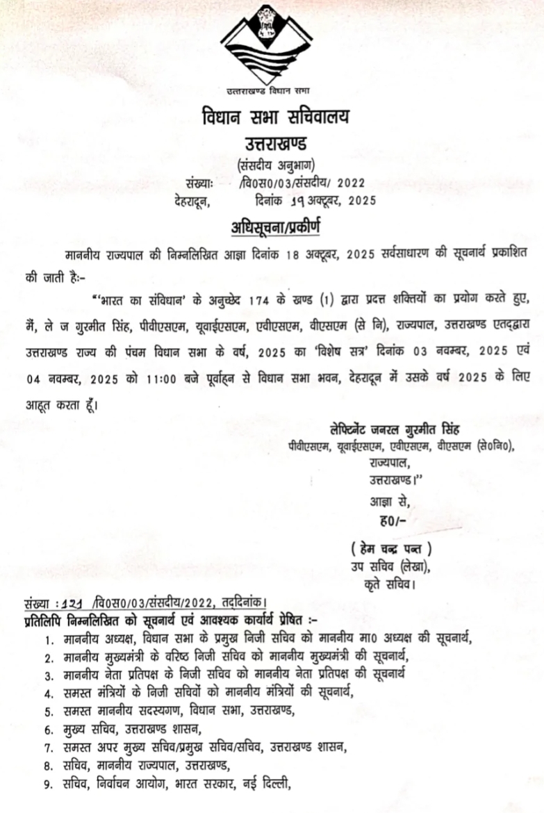 राज्यपाल की अधिसूचना के अनुसार, विशेष सत्र 3 और 4 नवंबर 2025 को पूर्वाह्न 11 बजे से देहरादून स्थित विधानसभा भवन में आयोजित होगा। यह अधिसूचना 18 अक्टूबर 2025 को राजभवन की ओर से जारी की गई।